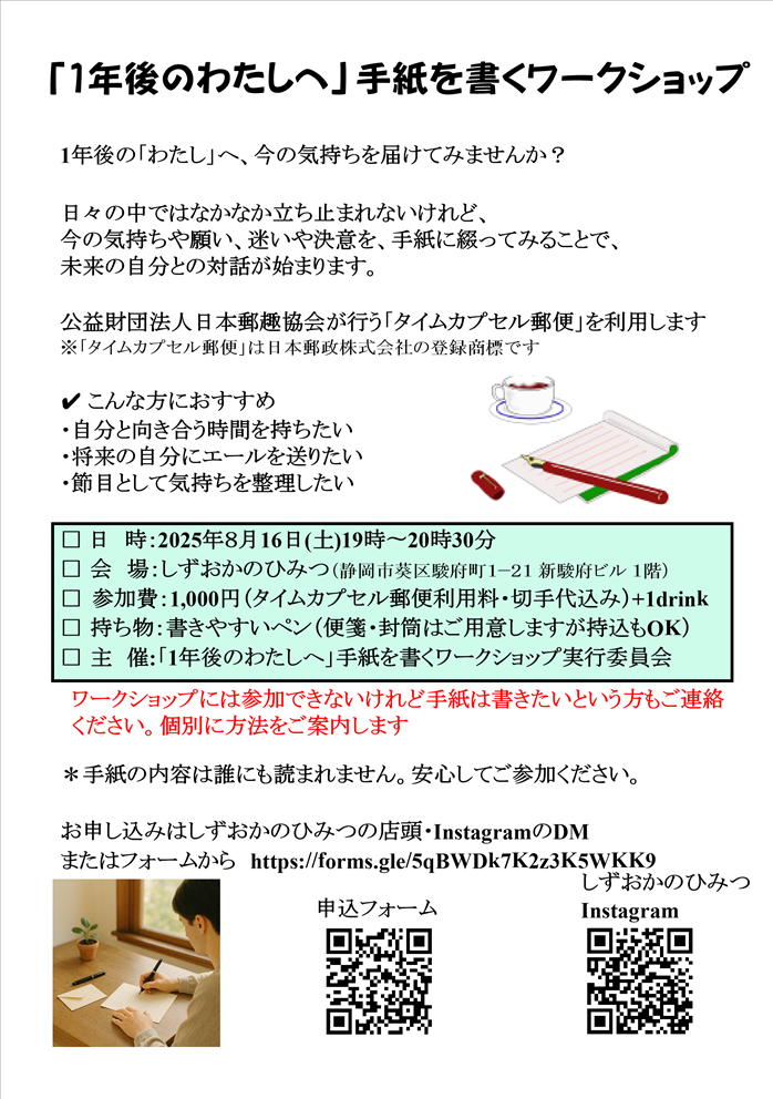 参加費:1,000円(タイムカプセル郵便利用料・切手代込み)+1drink